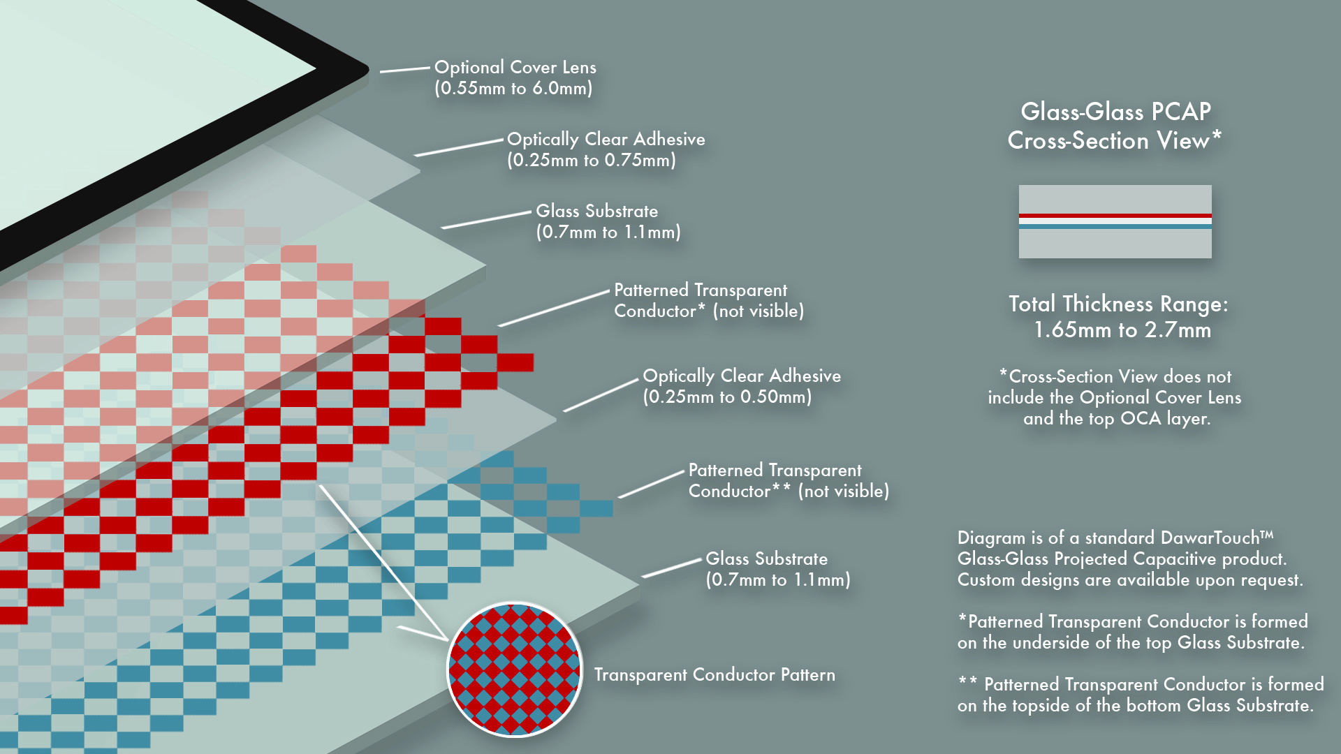 | Stackup Thickness | 1.65mm to 2.7mm* *Thickness range above does not include front cover lens. |